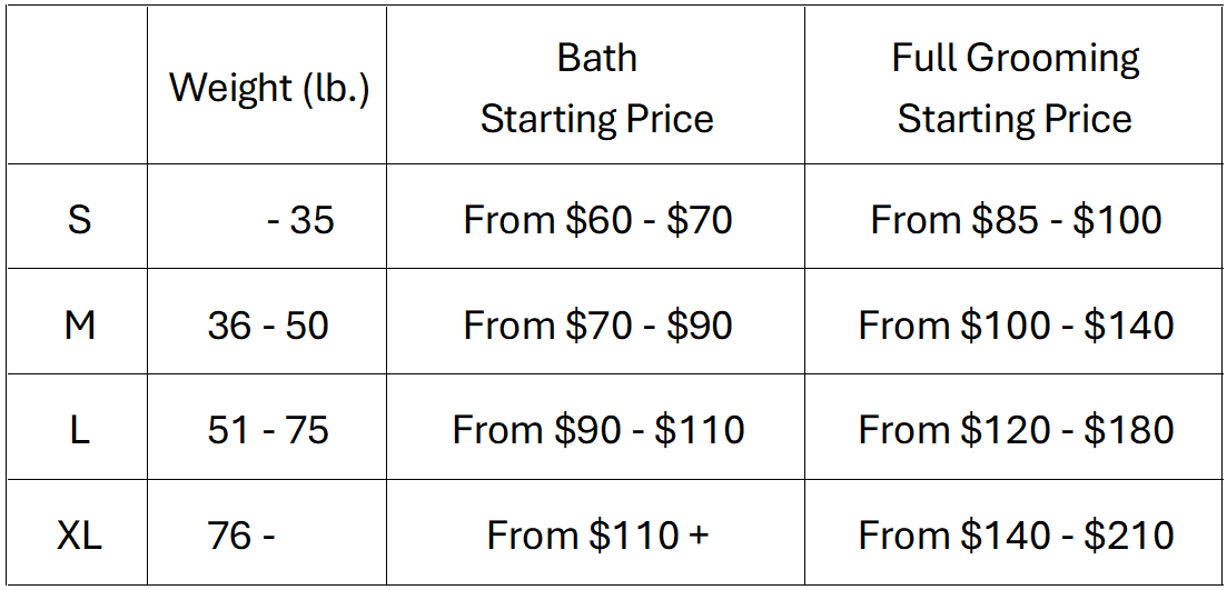 • Some conditions (such as fleas, matting, or behavior concerns) may only be identified during grooming and can affect the final price.